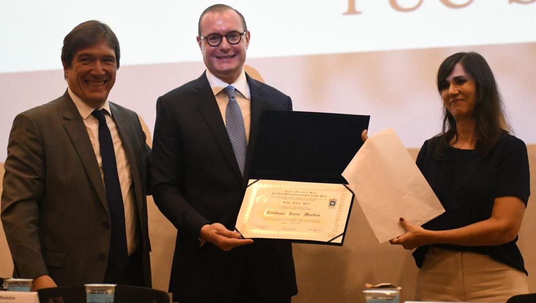 O chefe de gabinete ressaltou o caráter coletivo do título concedido ao ministro. “A tramitação comunitária do processo de concessão do título revela que nossa comunidade puquiana está muito lisonjeada em reconhecer merecidamente o brilhantismo do nosso aluno Cristiano Zanin. Vale ressaltar, como sempre relembra nosso reitor, que ele é o primeiro ministro do STF com graduação em Direito na PUC-SP. É fato que outros ministros da Suprema Corte já estudaram na nossa Universidade, mas sempre na pós-graduação. Puquiano raiz, desde a graduação, Zanin é o primeiro, para nossa honra. Com a certeza não será o último. Ele está, certamente, inaugurando uma tradição”, afirmou Leonardo.