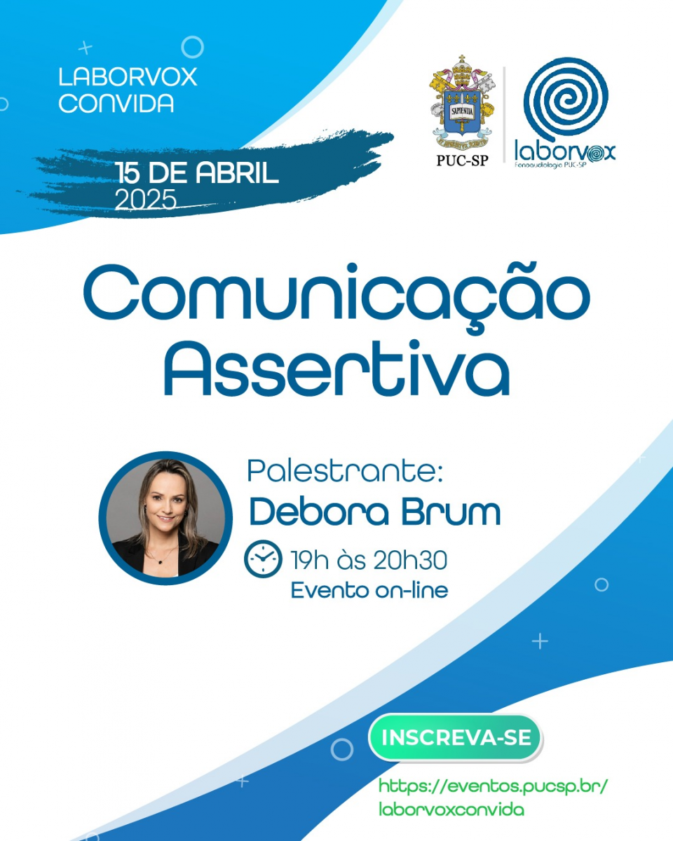 O Laborvox (Faculdade de Ciências Humanas e da Saúde) realiza, dia 15/4, às 19h, a palestra Comunicação Assertiva, com Debora Brum. Clique aqui para se inscrever no evento online.