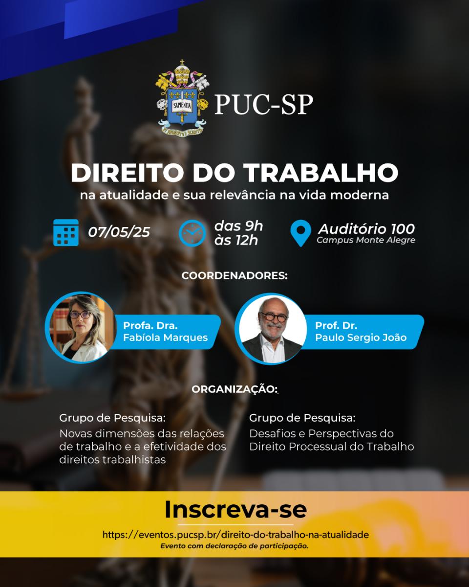 Dia 7/5, às 9h, acontece o evento Direito do Trabalho na atualidade e sua relevância na vida moderna, no auditório 100 (1º andar, prédio novo, campus Monte Alegre). Clique aqui para se inscrever. Haverá transmissão online.