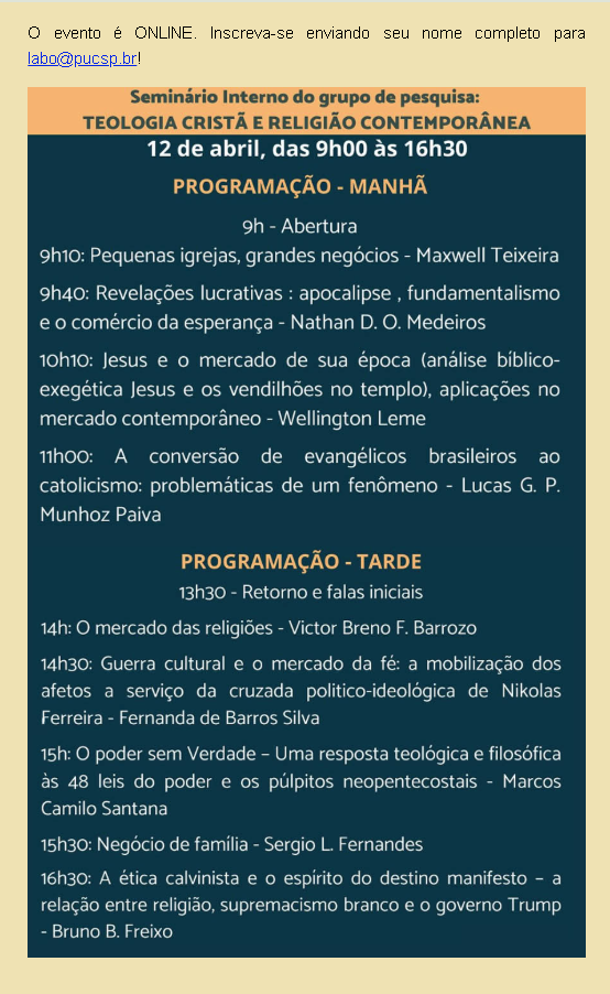 O Grupo Teologia Cristã e Religião Contemporânea, coordenado por André Anéas e Lorena C. O. Tiroel, convida para o seu seminário interno no dia 12/4, sábado, manhã e tarde.
