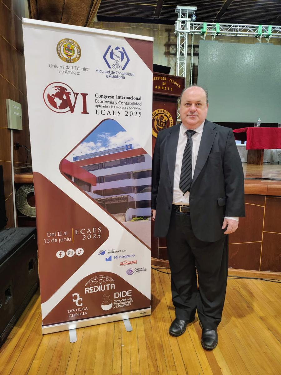 O prof. Fernando de Almeida Santos, coordenador do Pós em Ciências Contábeis, Controladoria e Finanças, participou do Congreso Internacional Economía e y Coontabilidad, realizado na UTA (Univeridad de Ambato), Equador.