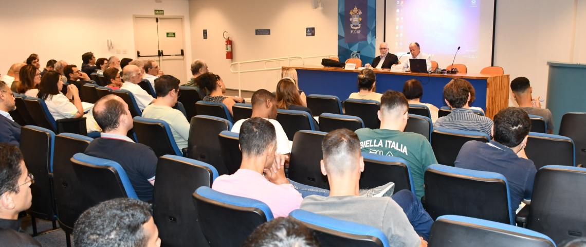 Aula magna com o prof. Marcelo Perine (Filosofia) marca o início do ano letivo da Pós-Graduação da PUC-SP, em 26/2. O pró-reitor de Pós-Graduação, Antonio Valverde, também participou da atividade.