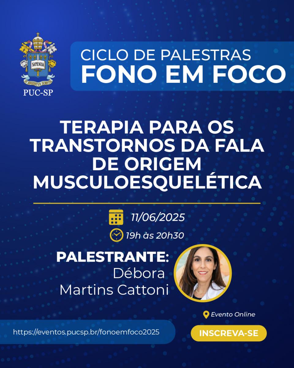 No dia 11/6, se encerra o Ciclo de Palestras - FONO em FOCO 2025, do primeiro semetrse. O tema Terapia para os transtornos da fala de origem muscoesquelética será abordado por debora Martins Cattoni.