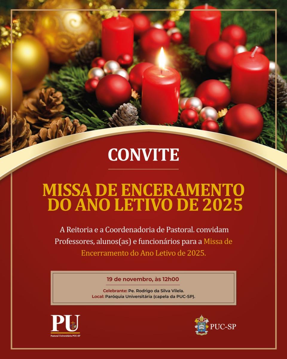 No dia 19 de novembro, às 12h, será celebrada a tradicional missa de encerramento do ano letivo da PUC-SP. A celebração será conduzida pelo Pe. Rodrigo da Silva Vilela, coordenador do Núcleo de Fé e Cultura.