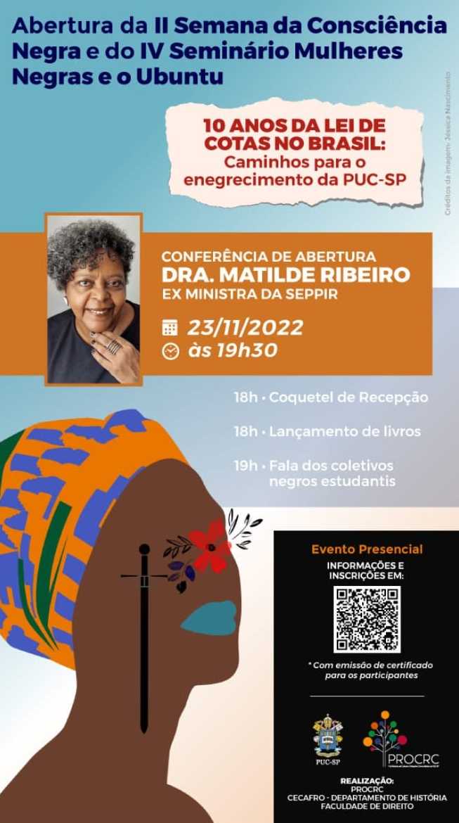 Profa. Matilde Ribeiro, ex-ministra da Secretaria Especial de Políticas de Promoção da Igualdade Racial (SEPPIR), realiza a abertura da II Semana da Consciência Negra da PUC-SP e do IV Seminário Mulheres Negras e o Ubuntu