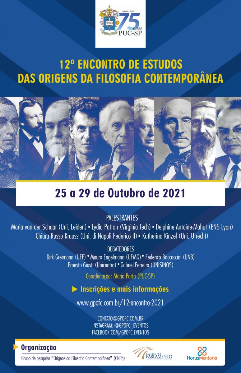 De 25 a 29/10, será realizado o 12º Encontro de Estudos das Origens da Filosofia Contemporânea. Haverá palestras de professoras internacionais, seguidas de debates com professores de universidades nacionais.