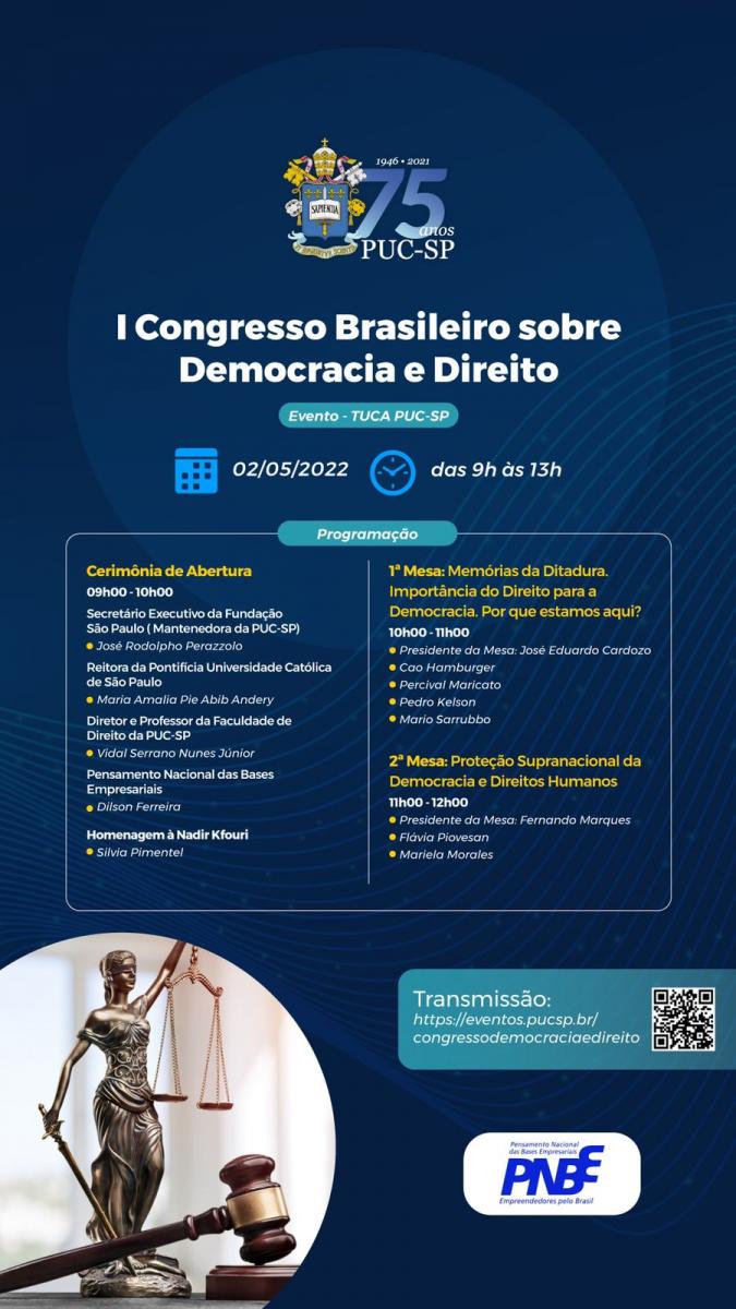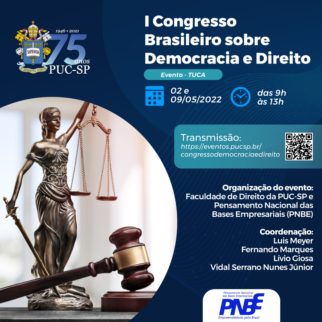Estão abertas as inscrições para o I Congresso Brasileiro sobre Democracia e Direito, que será realizado no Tuca, dias 2 e 9/5, das 9 às 13h.