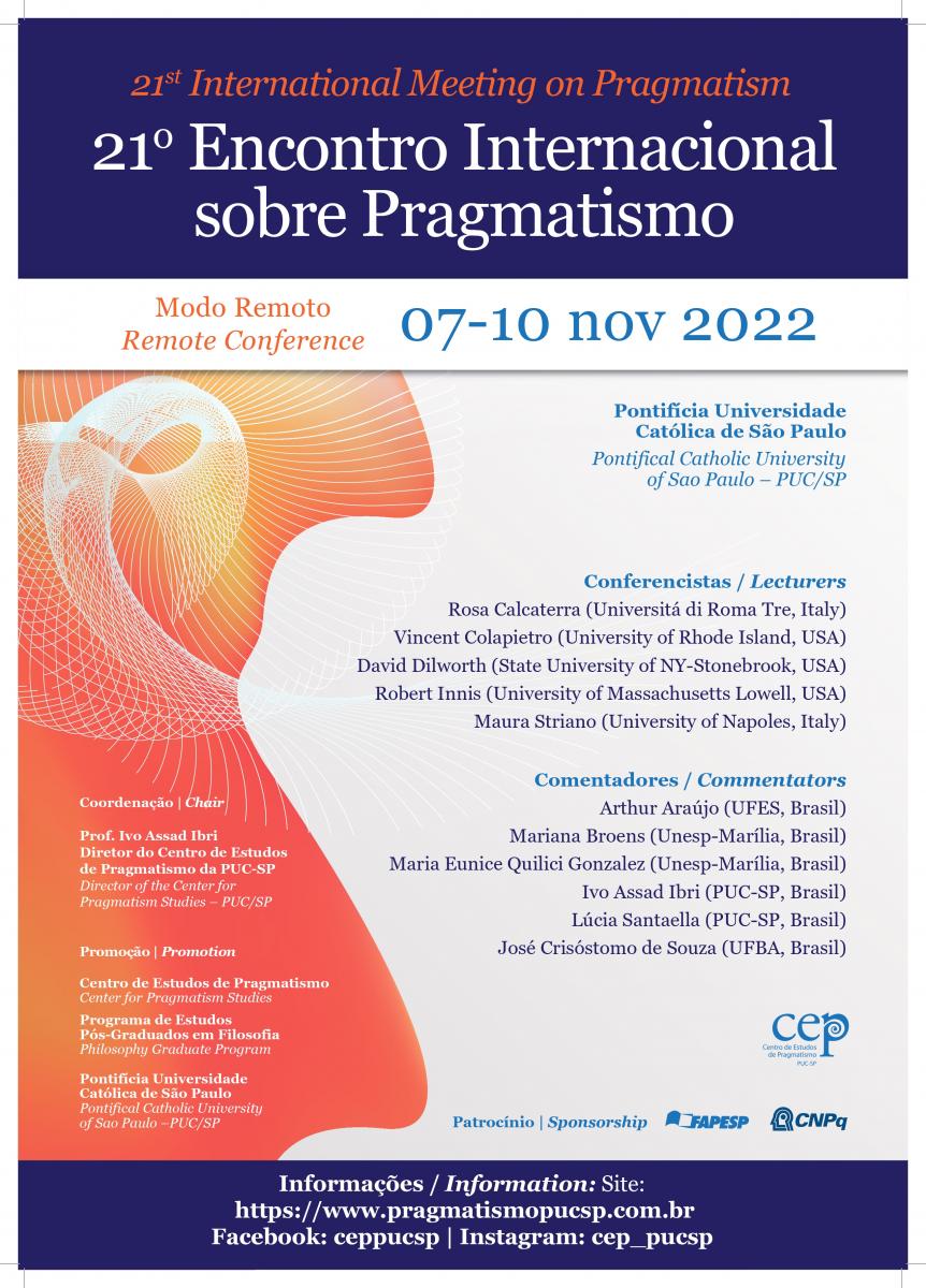 De 7 a 10/11, se realiza o 21º Encontro sobre Pragmatismo, de maneira remota. Organizado pelo Centro de Estudos sobre Pragmatismo, do Pós em Filosofia, o evento recebeu inscrições de ouvintes até o dia 31/10.