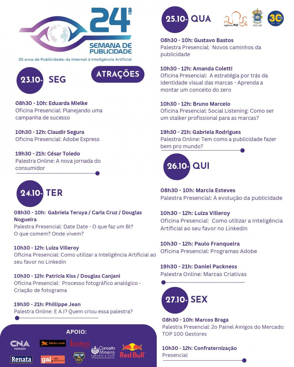 Entre 23 e 27/10, acontece a 24ª Semana de Publicidade e Propaganda, que celebra os 30 anos do curso de graduação e os 18 anos da Agência PUC