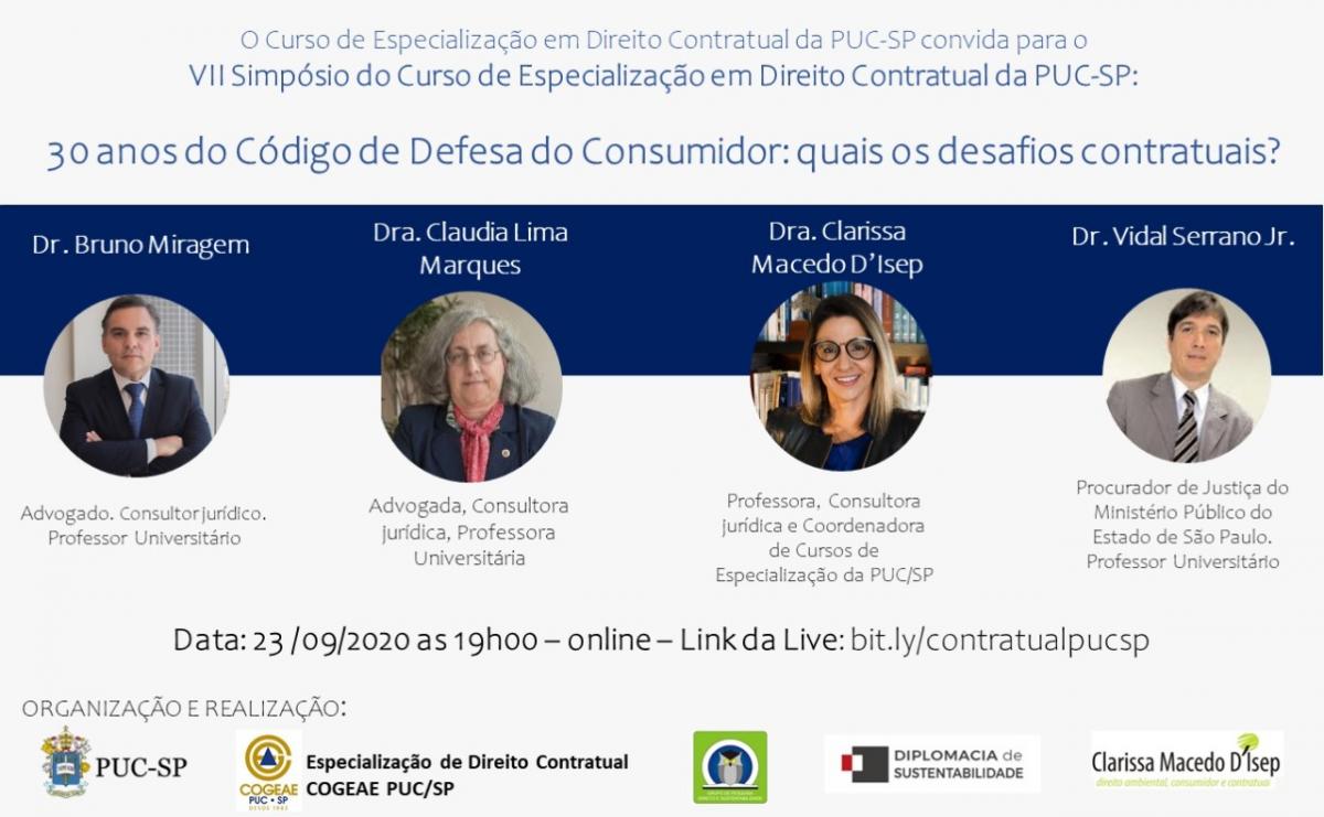 Dia 23/9, às 19h, o curso de Especialização em Direito Contratual realiza seu VII Simpósio, com a live “30 anos do Código de Defesa do Consumidor: quais os desafios contratuais?”.