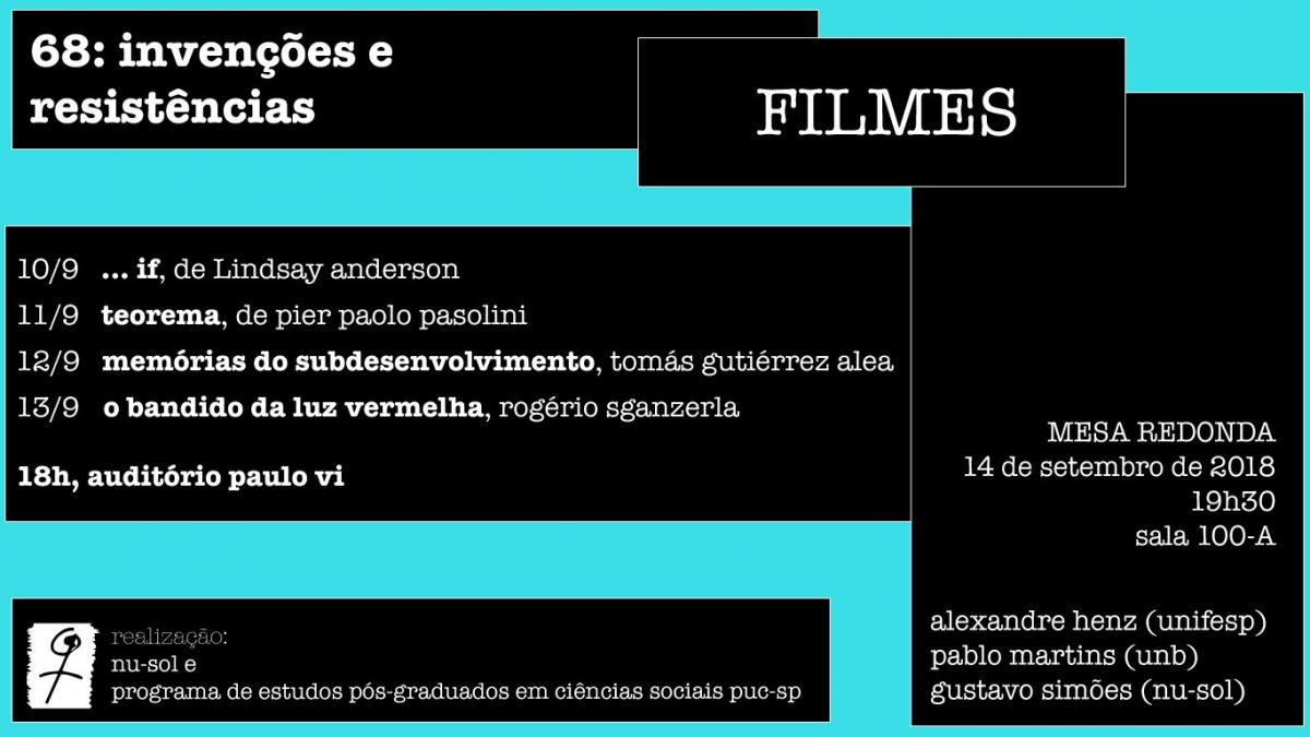 O Núcleo de Sociabilidade Libertária (Nu-sol, Pós em Ciências Sociais) exibe três filmes e realiza uma mesa-redonda, dentro do evento 68: invenções e resistências. As exibições ocorrem de 10 a 13/9, às 18h, no campus Monte Alegre, auditório Paulo VI (térreo, prédio novo). A mesa-redonda será em 14/9, às 19h30, na sala 100-A (1º andar, prédio novo).