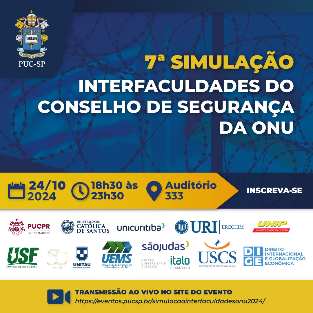 A Faculdade de Direito da PUC-SP promove o 7ª Simulação Interfaculdades do Conselho de Segurança da ONU. Atividade acontece no dia 24/10, das 18h30 às 23h30, no auditório 333.