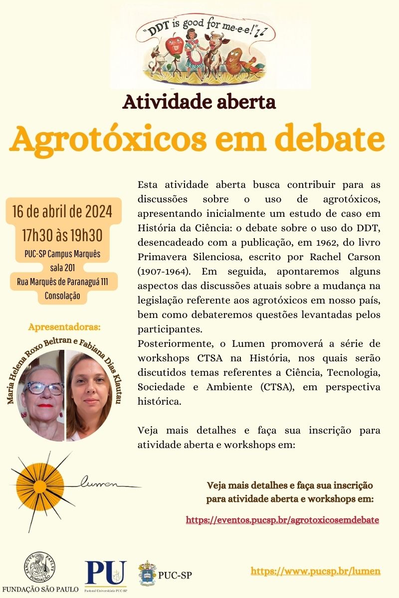 Haverá a apresentação de um estudo de caso em História da Ciência: o debate sobre o uso do DDT, desencadeado com a publicação, em 1962, do livro Primavera Silenciosa, escrito por Rachel Carson (1907-1964). Em seguida, considerando, em especial, as argumentações levantadas contra e a favor do uso do DDT, serão apresentados alguns aspectos das discussões atuais sobre a mudança na legislação referente aos agrotóxicos em nosso país, bem como debateremos questões levantadas pelos participantes.