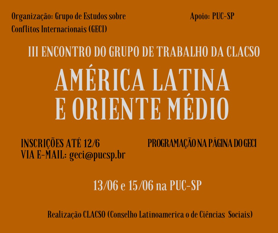 Cerca de quinze pesquisadores estarão na PUC-SP, dias 13 e 15/6, para o III Encontro do Grupo de Trabalho da Clacso (Conselho Latino-Americano e Ciências Sociais). Este ano, o tema geral é América Latina e Oriente Médio, que será debatido a partir dos eixos temáticos Política Externa para Oriente Médio – Diásporas e Identidades (13/6) e Como ensinar Oriente Médio a partir da América Latina – Estado e Sociedade no Oriente Médio (15/6).