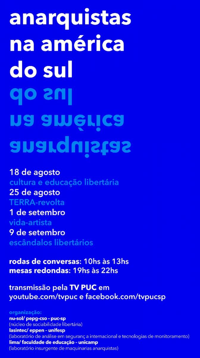 O Núcleo de Sociabilidade Libertária (Nu-sol, Pós em Ciências Sociais) realiza o evento Anarquistas na América do Sul, nos próximos dias 18/8, 25/8, 1º/9 e 9/9.
