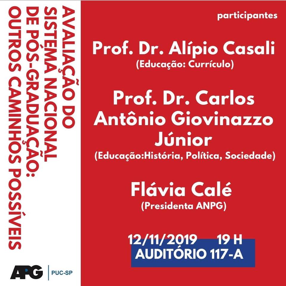 Participam os profs. Alípio Casali (Pós em Educação: Currículo), Carlos Giovinazzo (Pós em EHPS) e Flávia Calé (presidenta da ANPG), com mediação da APG PUC-SP.