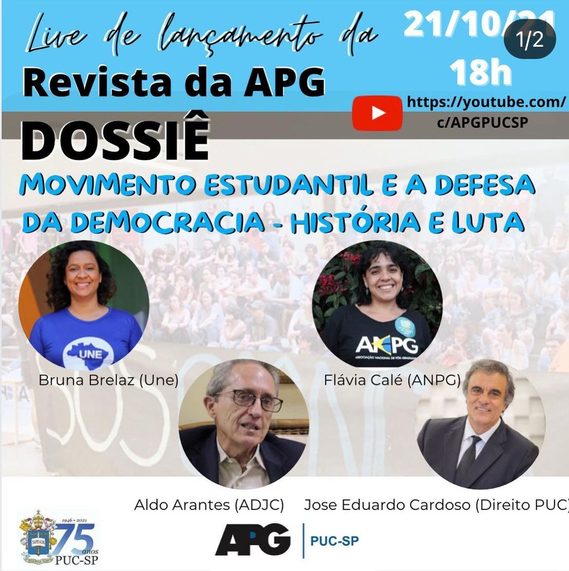 Para marcar o retorno da revista, haverá um encontro online de lideranças estudantis, com Bruna Brelaz (UNE), Flávia Calé (ANPG), Aldo Arantes (ADCJ) e José Eduardo Cardoso (Direito - PUC-SP). A atividade contece dia 21/10, às 18h, pelo canal da APG, no YouTube.