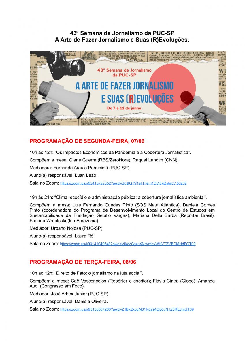 De 7 a 11/6, se realiza a 43º Semana de Jornalismo da PUC-SP, com o tema A Arte de Fazer Jornalismo e Suas (R)Evoluções.