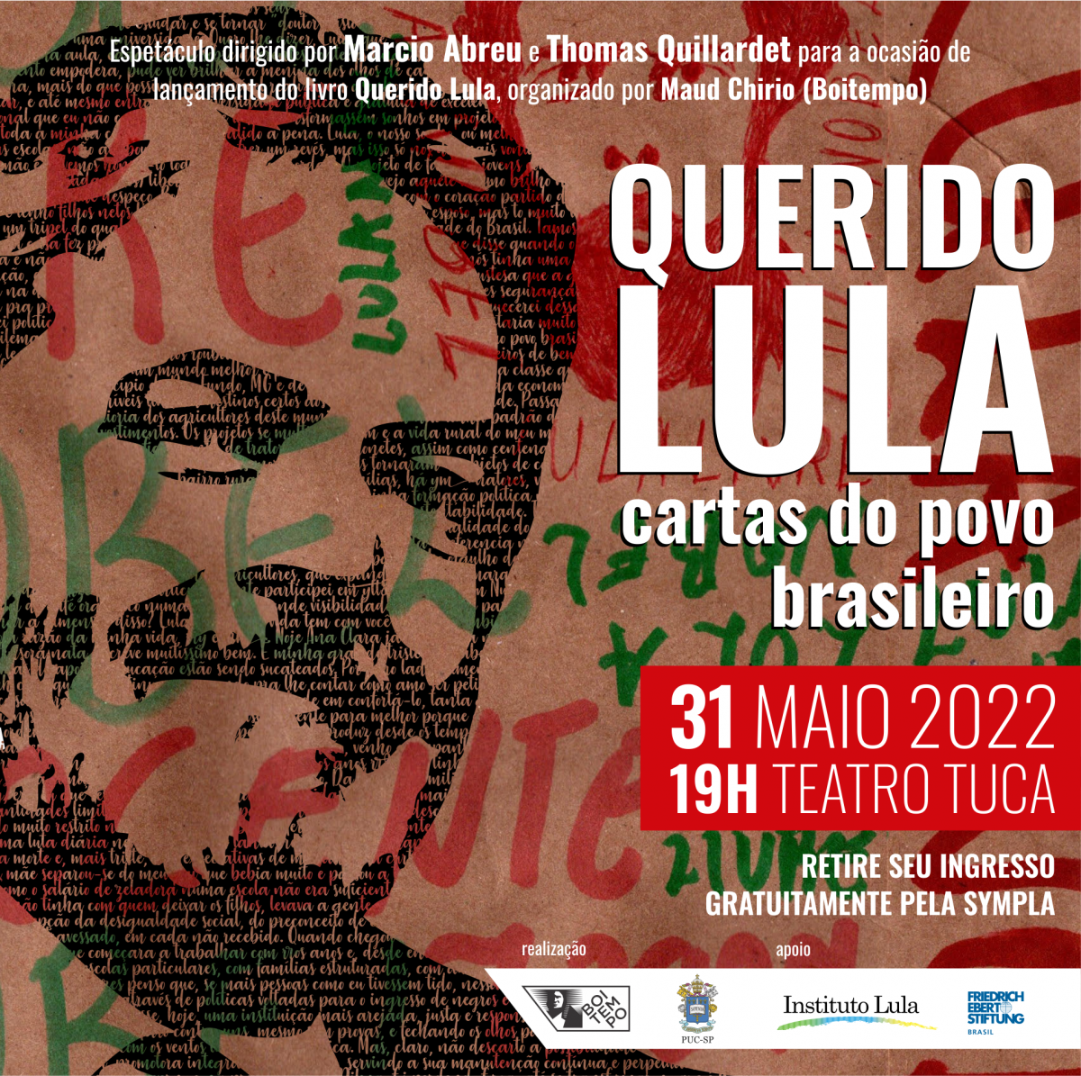 Diversos artistas participam da apresentação de Querido Lula, dia 31/5, às 19h, no Tuca. Está prevista a presença do ex-presidente na atividade da Boitempo, marcada para lançar o livro Querido Lula: cartas a um presidente na prisão. A obra reúne 46 textos, de um total de 25 mil enviados a ele durante o cárcere ilegal em Curitiba.