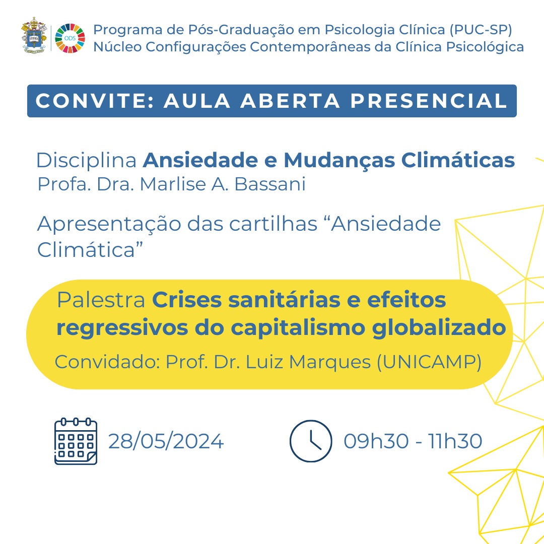 No dia 28/5, às 9h30, se realiza a aula aberta Ansiedade e Mudanças Climáticas, com o prof. Luiz Marques (Unicamp).