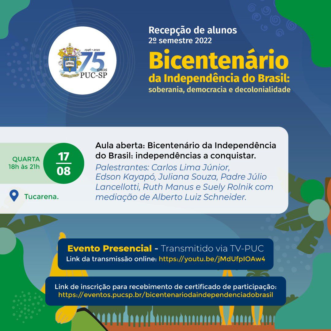 Esses e outros temas serão tratados no dia 17/8, das 18 às 21h, na aula aberta Bicentenário da Independência do Brasil: independências a conquistar, com Carlos Lima Júnior, Edson Kayapó, Padre Júlio Lancellotti, Juliana Souza, Ruth Manus, Suely Rolnik e mediação de Alberto Luiz Schneider.