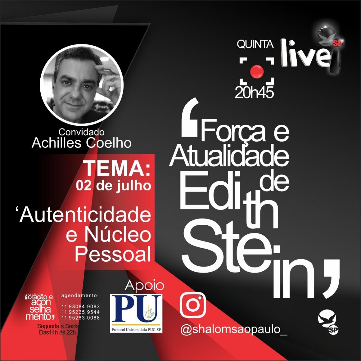 Dia 2/7, às 20h45 a Shalom São Paulo, em parceria com a Coordenadora da Pastoral Universitária da PUC-SP, realiza live no instagram com o tema Força e atualidade de Edith Stein: Autenticidade e Núcleo Pessoal. O convidado desta edição é Achilles Coelho.
