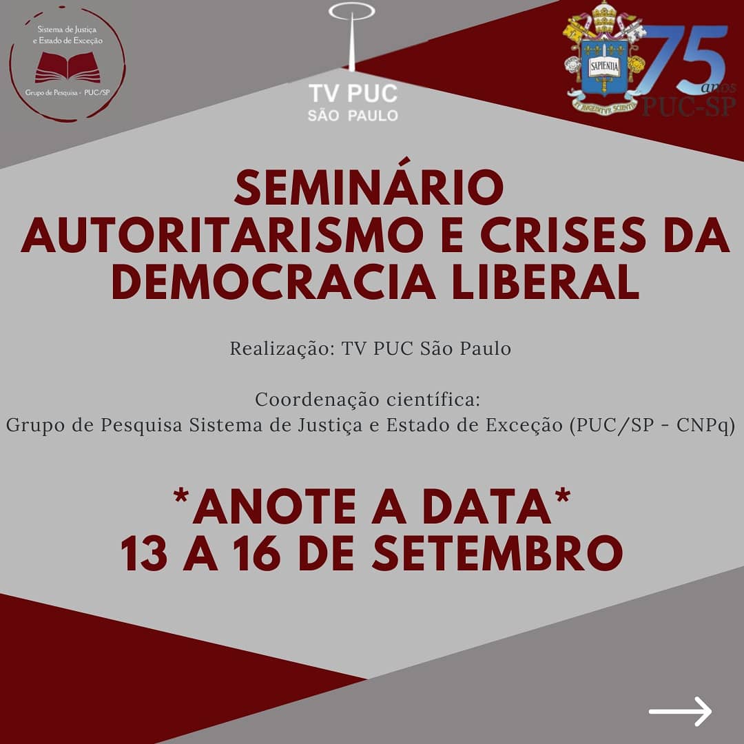 O Grupo de Pesquisa Sistema de Justiça e Estado Exceção (Direito) realiza, de 13 a 16/9, às 14h, o seminário Autoritarismo e crises da democracia liberal.
