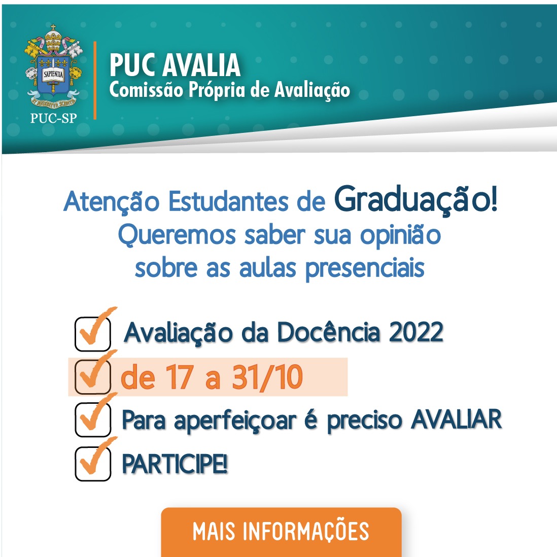 De 17 a 31/10, acontece a Avaliação da Docência 2022, organizada pela Comissão Própria de Avaliação (CPA). Realizada anualmente, tem como objetivo avaliar as práticas didático-pedagógicas e as condições de ensino da Universidade. Podem participar estudantes e professores de todos os cursos de graduação (exceto Medicina).