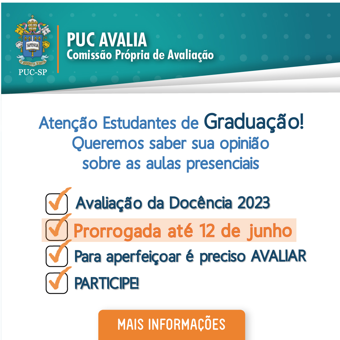 Até 12/6, acontece a Avaliação da Docência 2023, organizada pela Comissão Própria de Avaliação (CPA). Realizada anualmente, tem como objetivo avaliar as práticas didático-pedagógicas e as condições de ensino da Universidade. Podem participar estudantes e professores de todos os cursos de graduação.