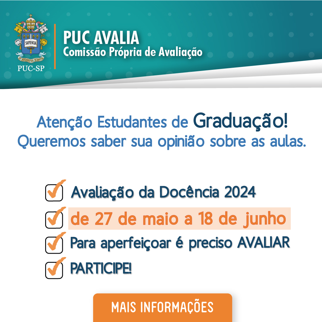De 27/5 até 18/6, acontece a Avaliação da Docência 2024, organizada pela Comissão Própria de Avaliação (CPA). Realizada anualmente, tem como objetivo avaliar as práticas didático-pedagógicas e as condições de ensino da Universidade.