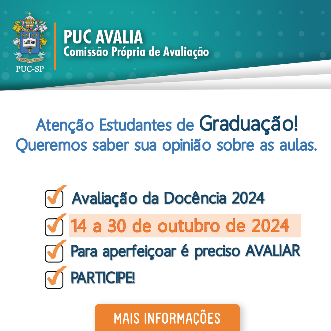 Hoje (30/10), é o último dia para participar da Avaliação da Docência 2024, organizada pela Comissão Própria de Avaliação (CPA). Realizada anualmente, tem como objetivo avaliar as práticas didático-pedagógicas e as condições de ensino da Universidade. Podem participar estudantes e professores de todos os cursos de graduação.