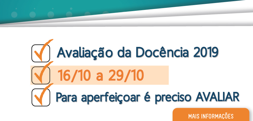 De 16 a 29/10, se realiza a Avaliação da Docência 2019, organizada pela Comissão Própria de Avaliação (CPA). Para saber mais e participar, clique aqui.