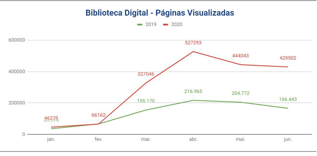Além do aumento no número de usuários, ficou evidenciado também o maior volume de informação consumida na plataforma, considerando que o total de páginas visualizadas em 2020 (linha vermelha) mais que duplicou em relação a 2019 (linha verde), como mostra o gráfico: