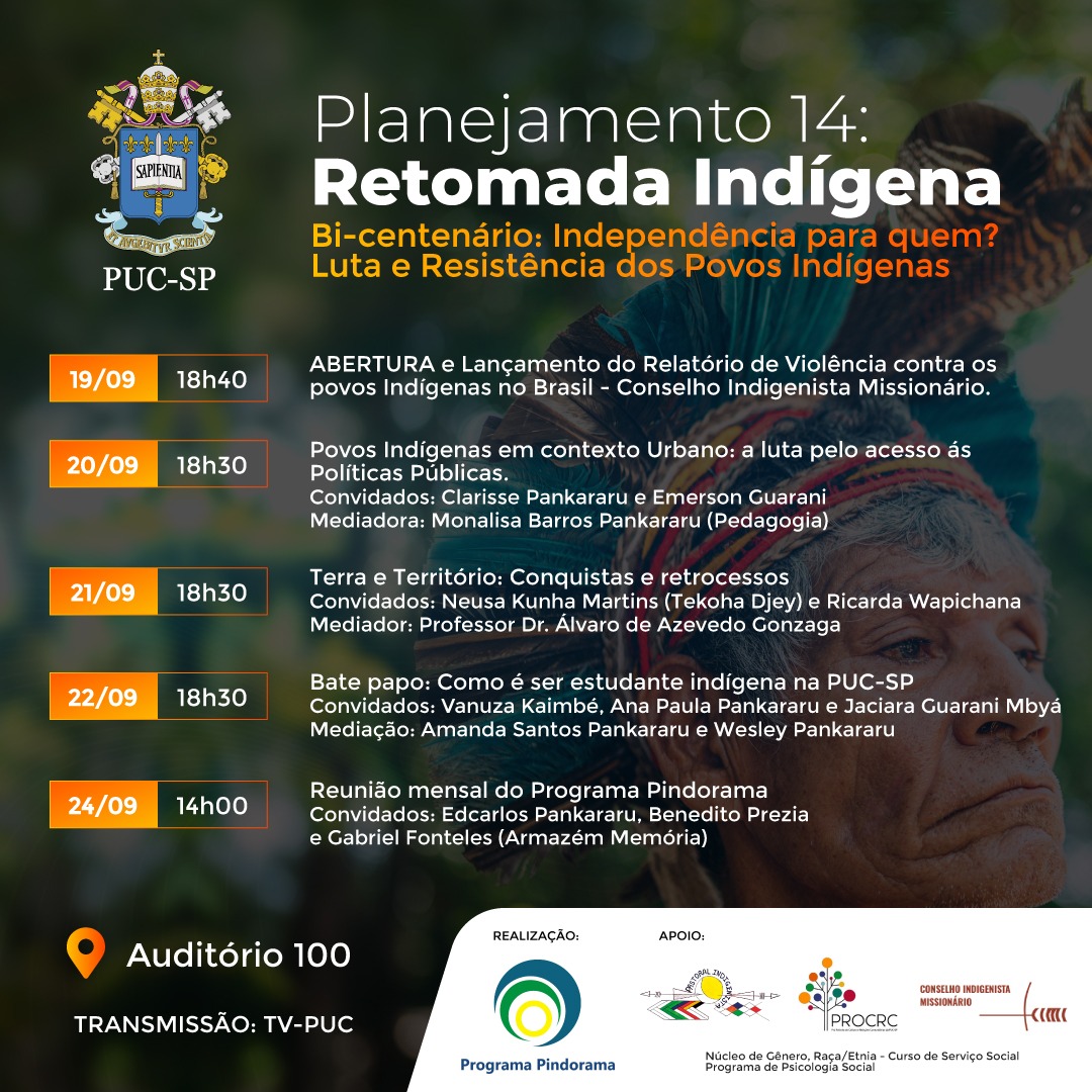 De 19 a 24/9, no campus Monte Alegre (auditório 100), acontece a Retomada Indígena, com o tema Bicentenário: independência para quem? Luta e resistência dos povos inídgenas. No dia 19/9, após a cerimônia de abertura, haverá o lançamento do Relatório de Violência Contra os Povos Indígenas no Brasil – Dados 2021.
