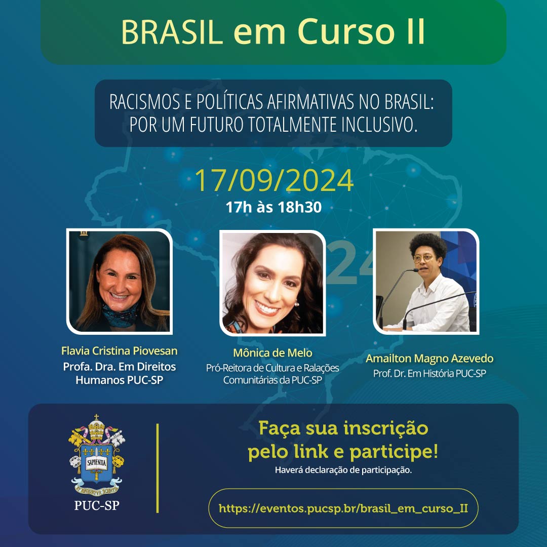 Organizado pela Reitoria da PUC-SP, desde sua primeira edição, realizada em 2020, o Brasil em Curso traz à universidade o papel de discutir e "elaborar diagnósticos, na produção crítica de conhecimento acerca das diferentes realidades e na gestação de perspectivas para a solução dos problemas a serem enfrentados a curto e médio prazos". Todas as aulas da primeira edição estão disponíveis em vídeo, neste link.