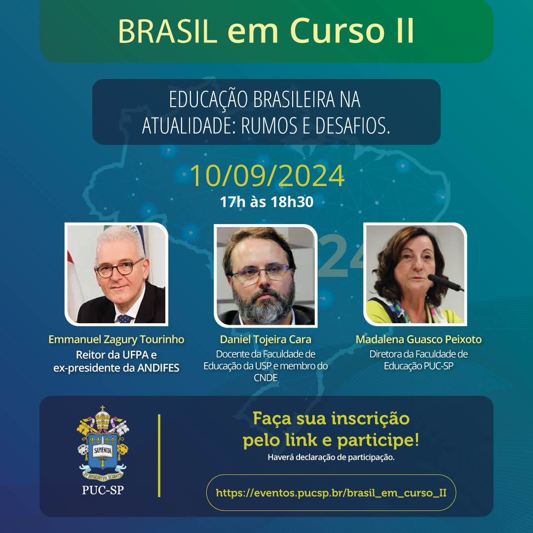 Organizado pela Reitoria da PUC-SP, desde sua primeira edição, realizada em 2020, o Brasil em Curso traz à universidade o papel de discutir e "elaborar diagnósticos, na produção crítica de conhecimento acerca das diferentes realidades e na gestação de perspectivas para a solução dos problemas a serem enfrentados a curto e médio prazos". Todas as aulas da primeira edição estão disponíveis em vídeo, neste link.