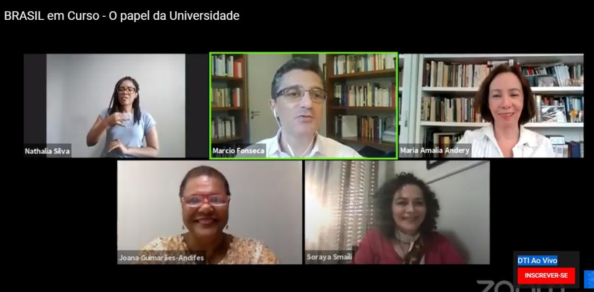 Na sequência, foi a vez de Joana Guimarães Luz (UFSB) que falou sobre a história da educação no Brasil e a origem da universidade, com seu papel inicial de servir a elite, ao mesmo tempo que representava a diversidade, o saber e o desenvolvimento do conhecimento. “A universidade reflete a coletividade que está fora dos seus muros. E, mesmo no aspecto elitista, ela apesar de suas contradições tem um papel de fundamental importância para a sociedade e faz com que tenhamos desenvolvimento de tantas ideias e questões que estão colocadas hoje. É preciso entender a universidade que temos hoje, no momento em que vivemos numa situação de pandemia e dificuldade no sentido político, e também dar conta da diversidade de questões colocadas pela coletividade. A pandemia trouxe grandes demandas e nos mostrou a necessidade de buscar outras formas de conhecimento e caminhos para lidar com essa nova situação”.