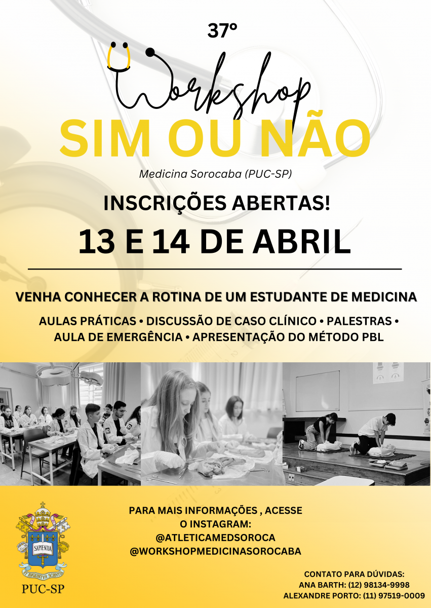 A Associação Atlética Acadêmica “Vital Brazil” (A.A.A.V.B), com apoio da Faculdade de Ciências Médicas e da Saúde da PUC-SP (curso de Medicina), realiza o 37º Workshop Sim ou Não.