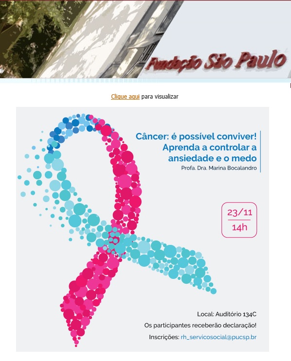 A DRH realiza dia 23/11, às 14h, a palestra Câncer: é possível conviver! Aprenda a controlar a ansiedade e o medo, com a profa. Marina Bocalandro. O evento acontece no campus Monte Alegre, auditório 134-C. Os participantes receberão certificado. Inscrições: rh_servicosocial@pucsp.br.