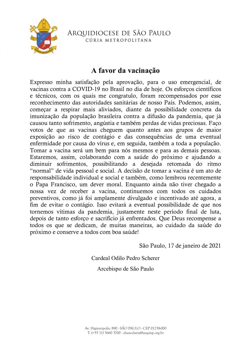 O Grão-Chanceler Cardeal Dom Odilo Pedro Scherer, Arcebispo Metropolitano de São Paulo, lançou um manifesto a favor da vacina.