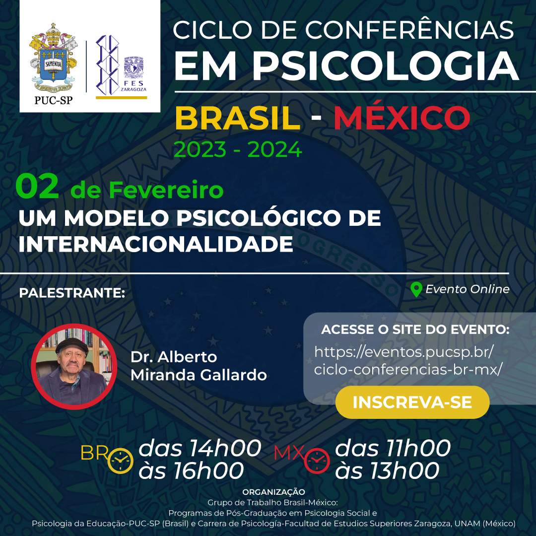 A PUC-SP promove mais um evento do Ciclo de conferências em Psicologia Brasil - México. A atividade, que acontece no dia 2/2, das 14h às 16h, de forma virtual, com o dr. Alberto Miranda Gallardo, aborda "Um modelo psicológico de internacionalidade".
