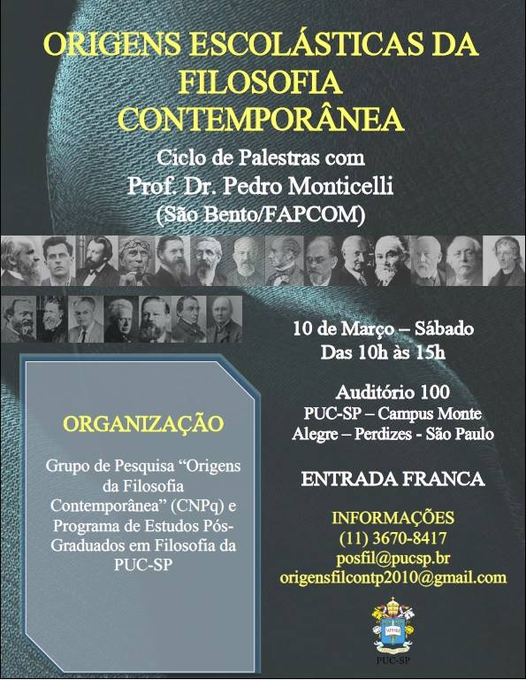 O ciclo de palestras será realizado no campus Monte Alegre, auditório 100 (1º andar, prédio novo). Organização: Grupo de Pesquisa "Origens da Filosofia Contemporânea" (CNPq) e Programa de Estudos Pós-Graduados em Filosofia da PUC-SP.