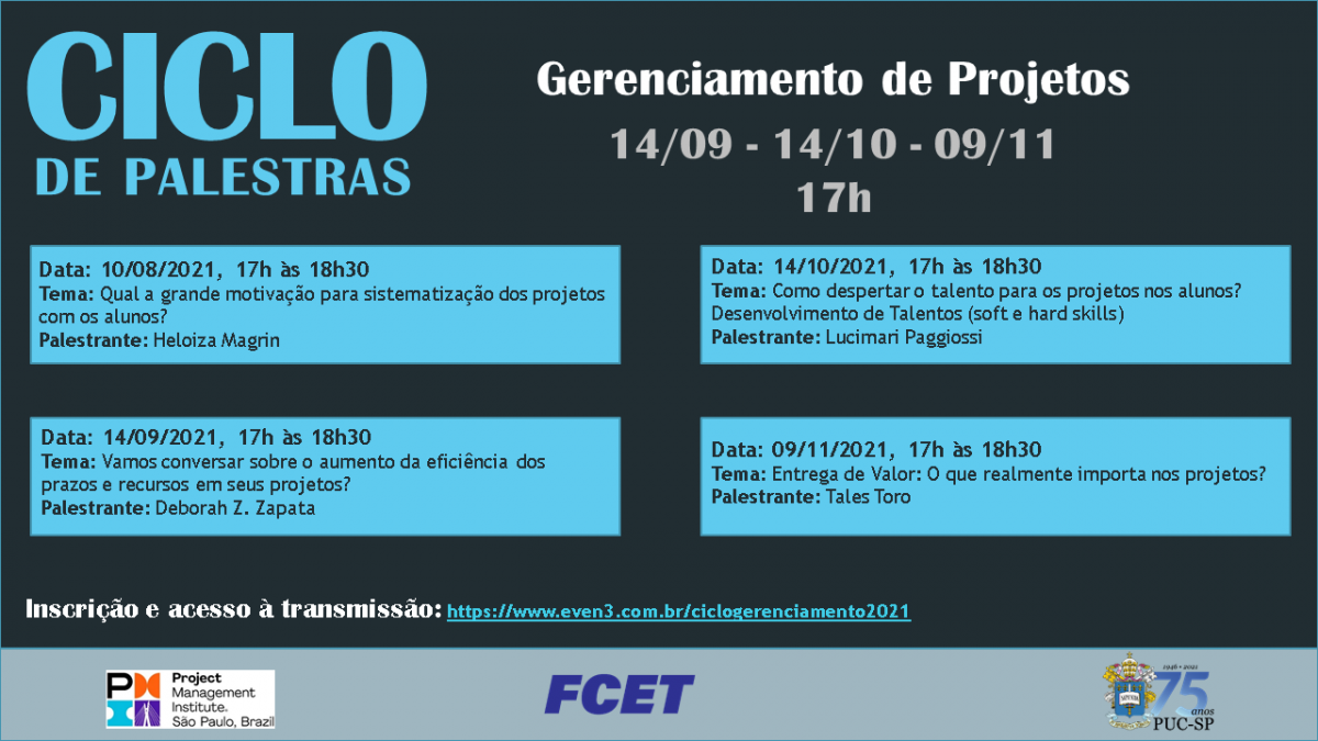 A Faculdade de Ciências Exatas e Tecnologia (FCET) realiza, em parceria com o PMI, o Ciclo de Palestras: Gerenciamento de Projetos. A atividade é destinada a professores da PUC-SP e acontece sempre das 17h às 18h30. Mais informações: fcet@pucsp.br.