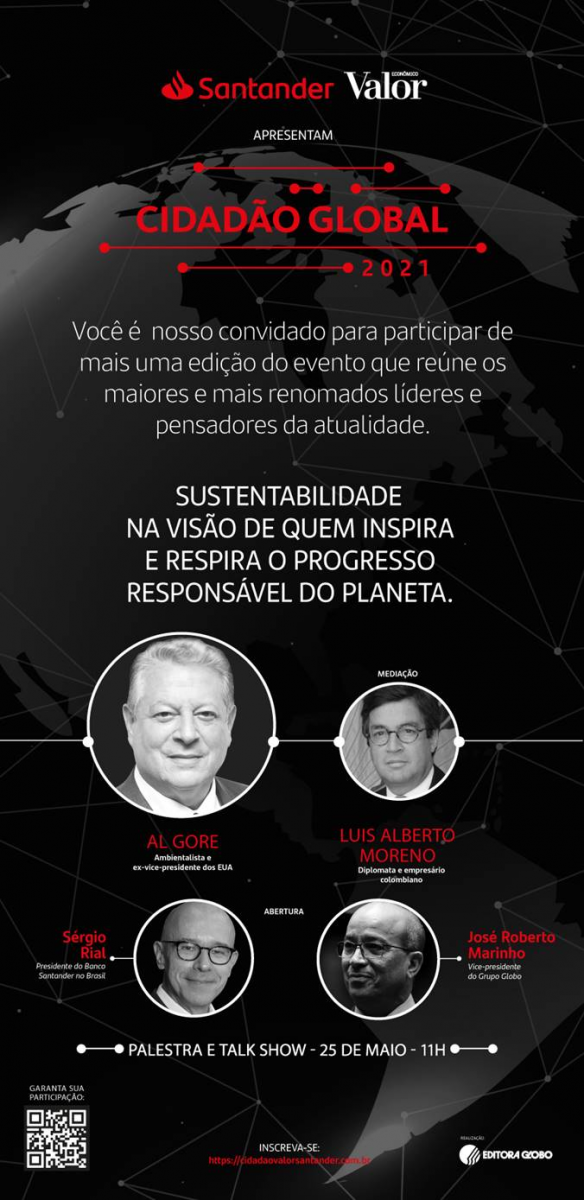 Estão abertas as inscrições para o evento Cidadão Global 2021, promovido pelo Santander e pelo Valor Econômico. Participam líderes e pensadores da atualidade, que falarão sobre o tema Sustentabilidade: inspirando e respirando o progresso responsável.