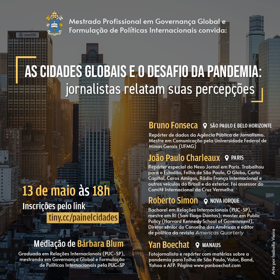 O Mestrado Profissional em Governança Global e Formulação de Políticas Internacionais realiza, dia 13/5, às 18h, o debate online As cidades globais e o desafio da pandemia: jornalistas relatam suas percepções.