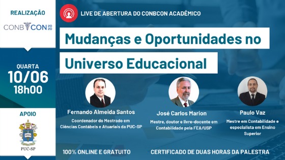 Estão abertas, até 8/6, as incrições para o 3º CONBCON ACADÊMICO - edição 2020, sessão do Congresso Online Brasileiro de Contabilidade, organizado pelo CONBCON em conjunto com o Programa de Mestrado Profissional em Ciências Contábeis, Controladoria e Finanças da PUC-SP. O objetivo é valorizar projetos acadêmicos, possibilitando a divulgação da pesquisa.