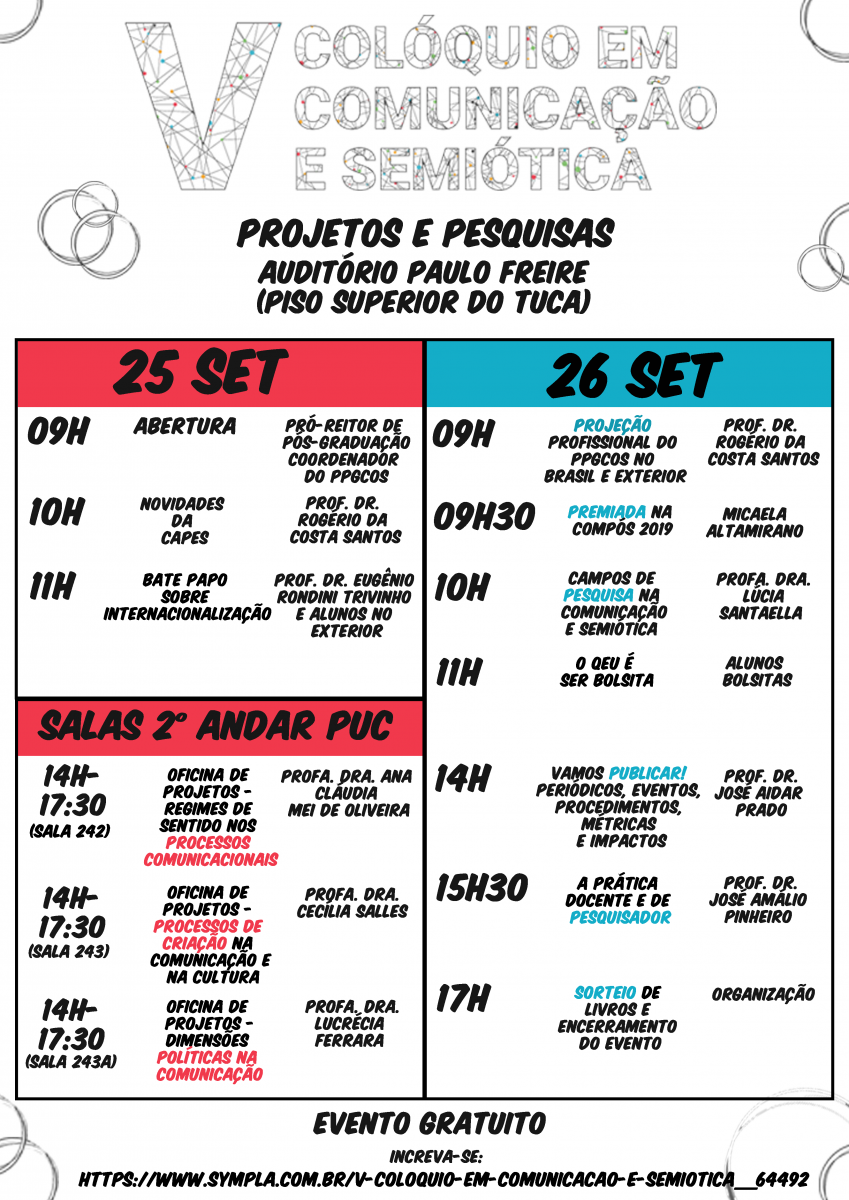 Nos dias 25 e 26/9, no auditório Paulo Freire (piso superior do Tuca), acontece o 5º Colóquio em Comunicação e Semiótica - Projetos e Pesquisas O evento é gratuito e as inscrições devem ser feitas em: https://www.sympla.com.br/v-coloquio-em-comunicacao-e-semiotica__644929.