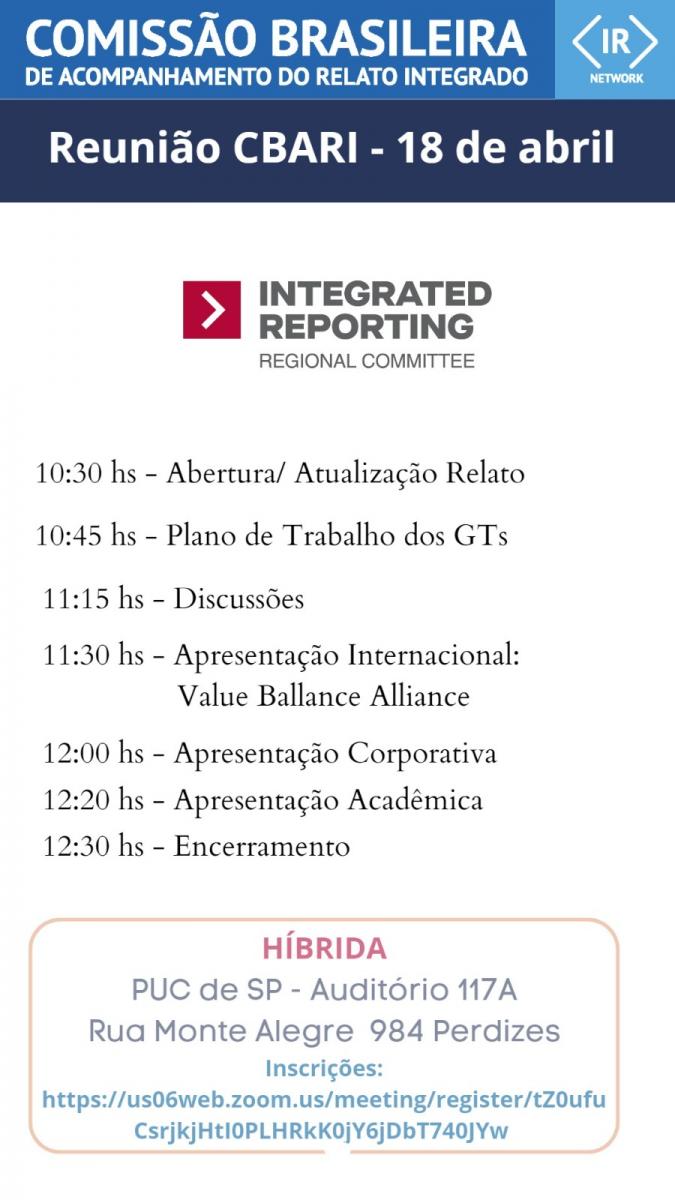 Dia 18/4, das 10h30 às 12h30, será realizada a primeira reunião de 2023 da Comissão Brasileira de Acompanhamento de Relatório Integrado (CBARI). O evento será no formato híbrido, com atividades presenciais e online.