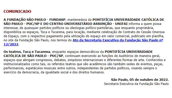 Leia abaixo comunicado da Fundação São Paulo sobre locação do Tuca e Tucarena: