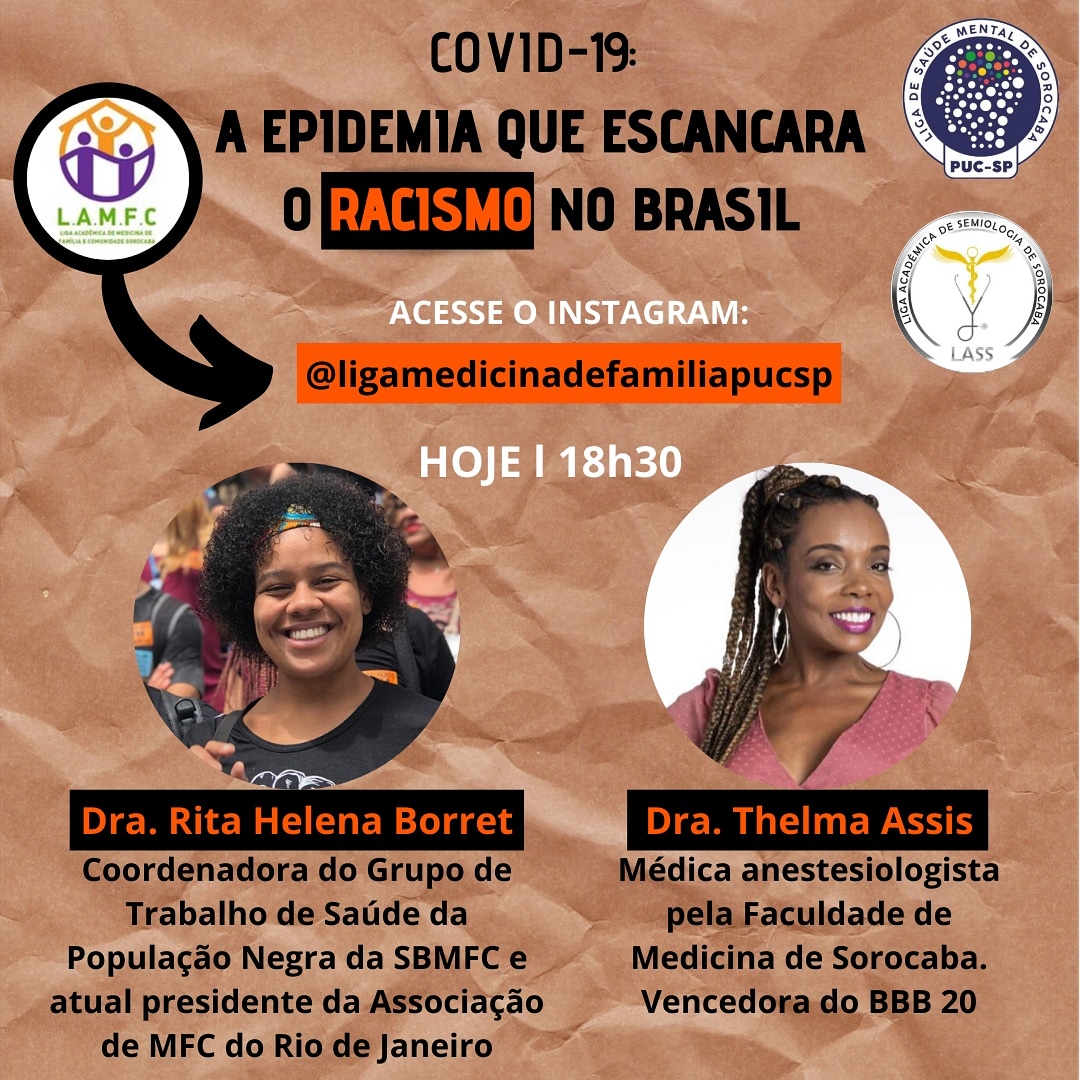A Liga Acadêmica de Medicina de Família e Comunidade, a Liga De Saúde Mental e a Liga de Semiologia de Sorocaba realizam, dia 6/5, às 18h30, o debate COVID-19: a epidemia que escancara o racismo no Brasil.